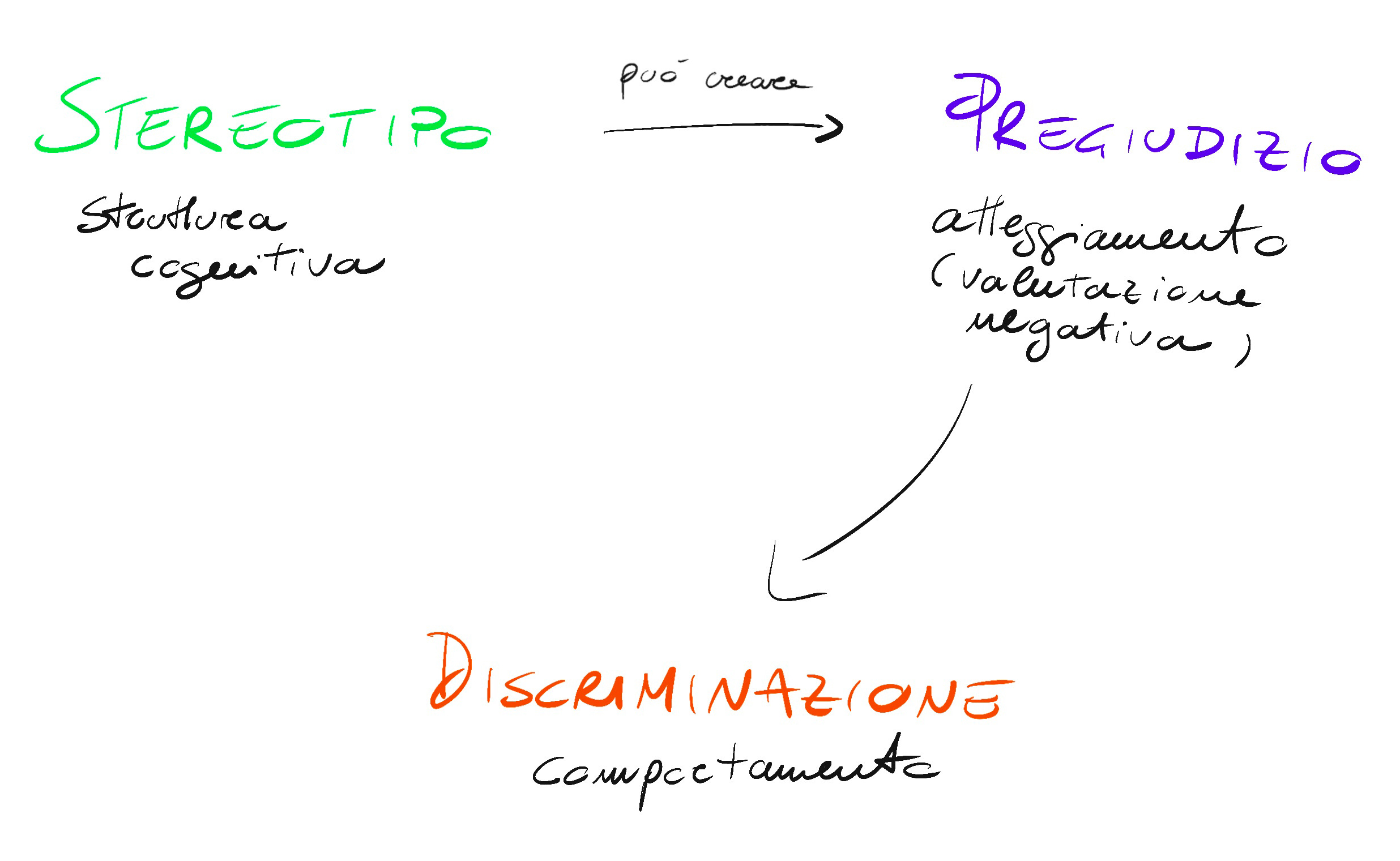 La discriminazione è un comportamento che può seguire un pregiudizio. Mi comporto in maniera differente con questa o quell’altra persona sulla base della valutazione che ho in mente. La discriminazione può essere più o meno esplicita, in base anche a quello che è ritenuto socialmente accettabile esprimere o mostrare in un certo contesto.