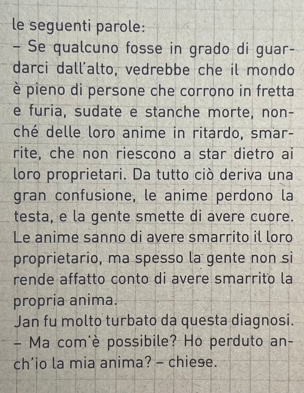 «Senza anima non viveva neanche male - dormiva, mangiava, lavorava, guidava la macchina e giocava perfino a tennis. A volte, però, aveva l'impressione che intorno a lui fosse diventato tutto piatto, gli sembrava di muoversi sul liscio foglio di un quaderno di matematica, un foglio ricoperto di quadretti tutti uguali e onnipresenti». Olga Tokarczuk e Joanna Concejo, L'anima smarrita.
